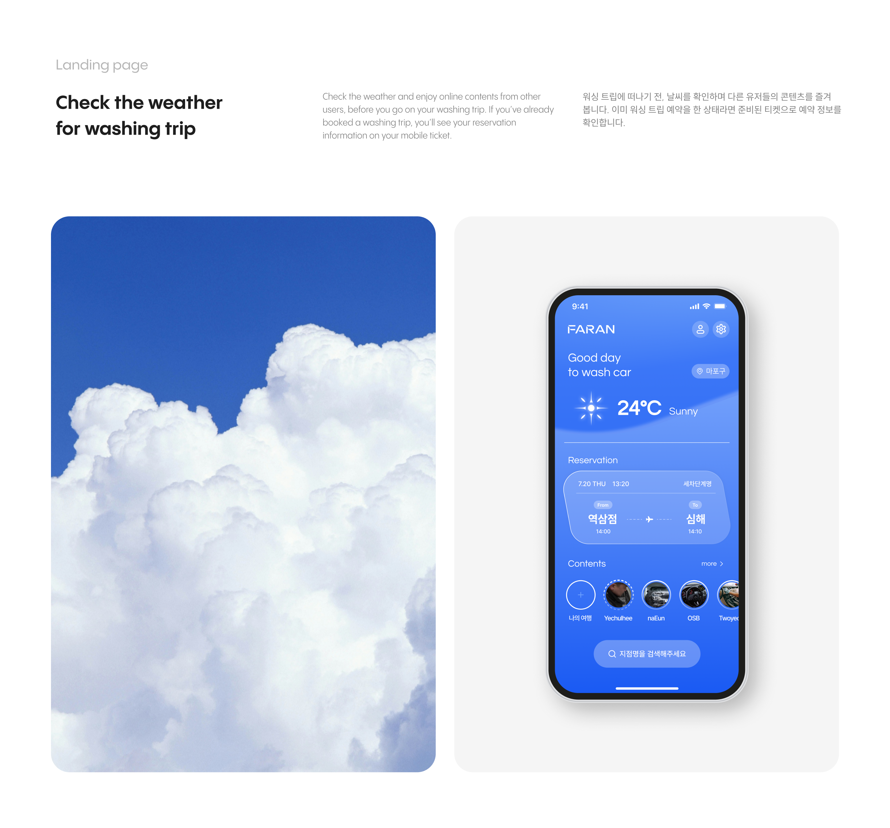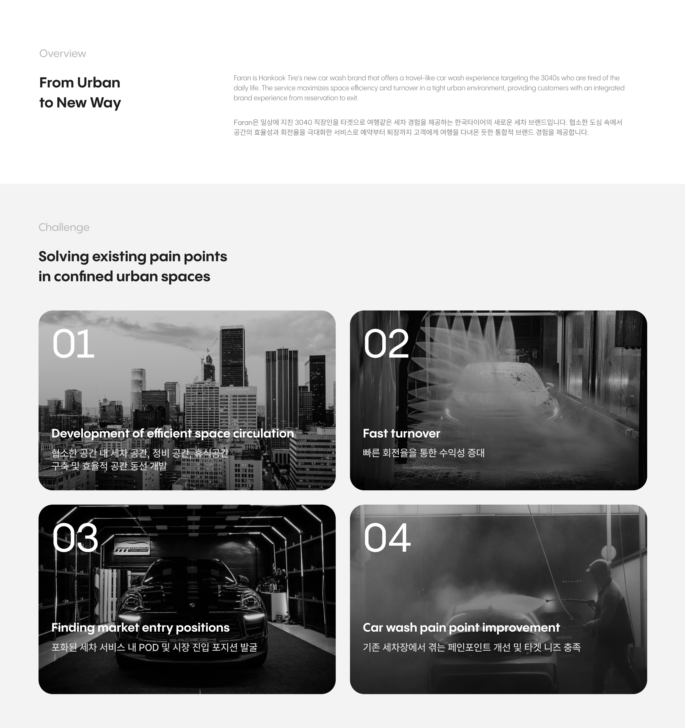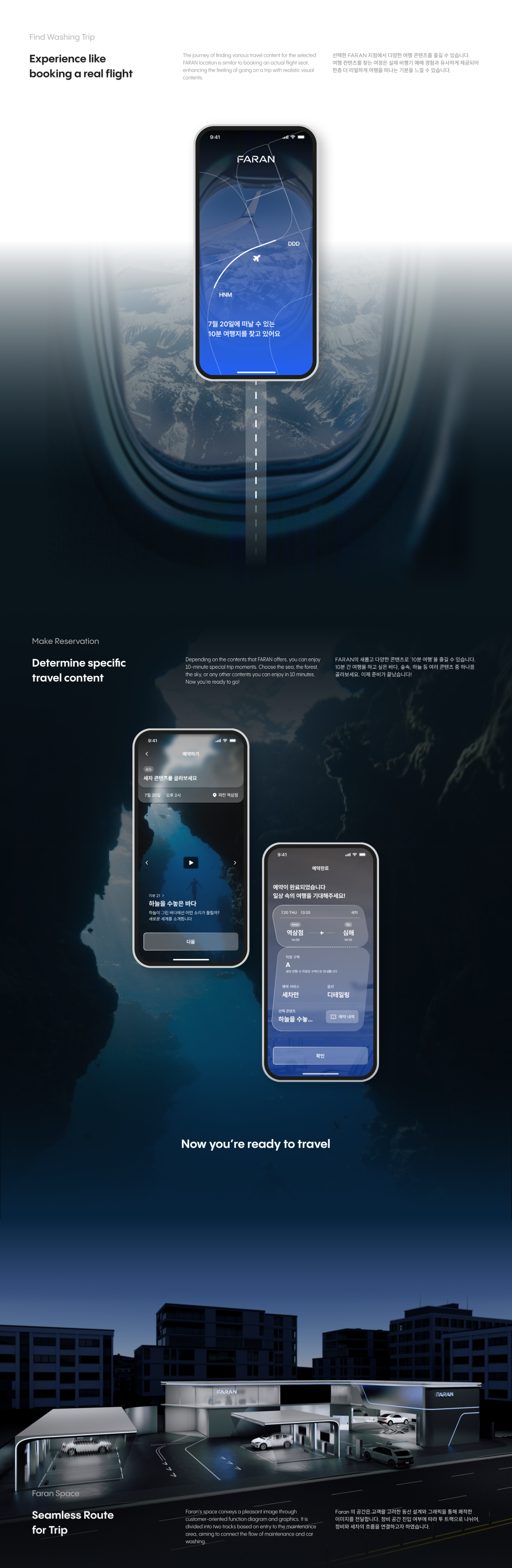 복잡한 도심 속 직장인들은 극심한 교통체증과 긴 기다림에 지쳐 있습니다. <파란>은 이러한 도시의 피로를 해결하기 위해, 협소한 공간에서도 합리적인 가격으로 프리미엄 세차 경험을 제공합니다. 공항을 모티프로 설계된 <파란>의 세차 프로세스는 공항의 체계적인 시스템을 차용하여 공간 효율과 회전율을 극대화했습니다. 단순한 세차를 넘어, 일상 속에서 잠시 여행을 다녀온 듯한 감각적이고 통합적인 브랜드 경험을 선사합니다.