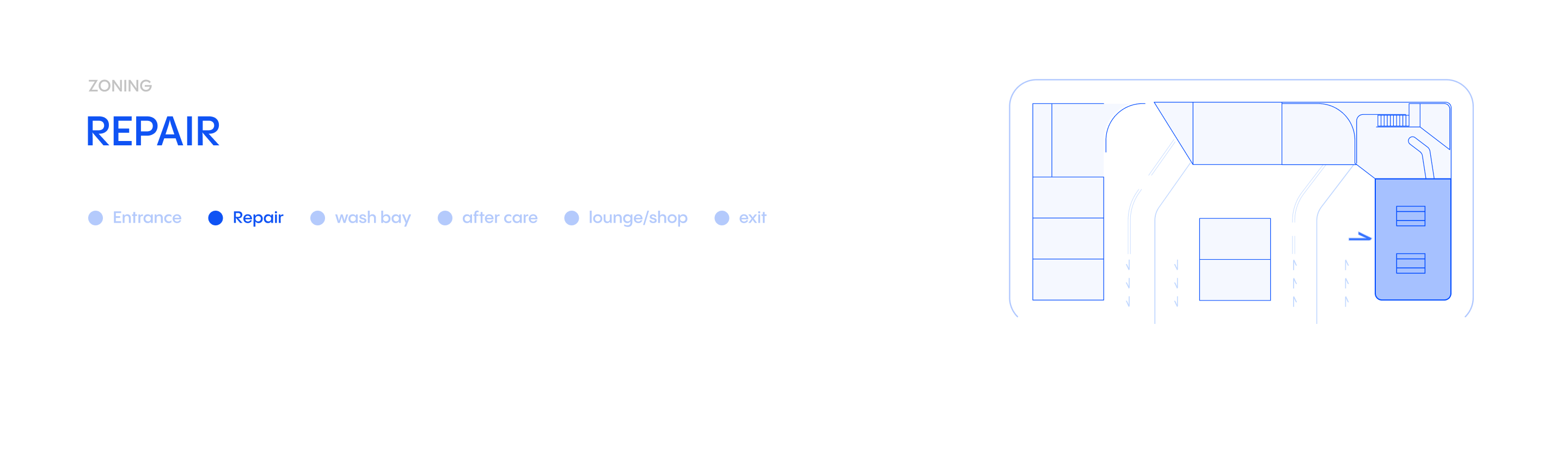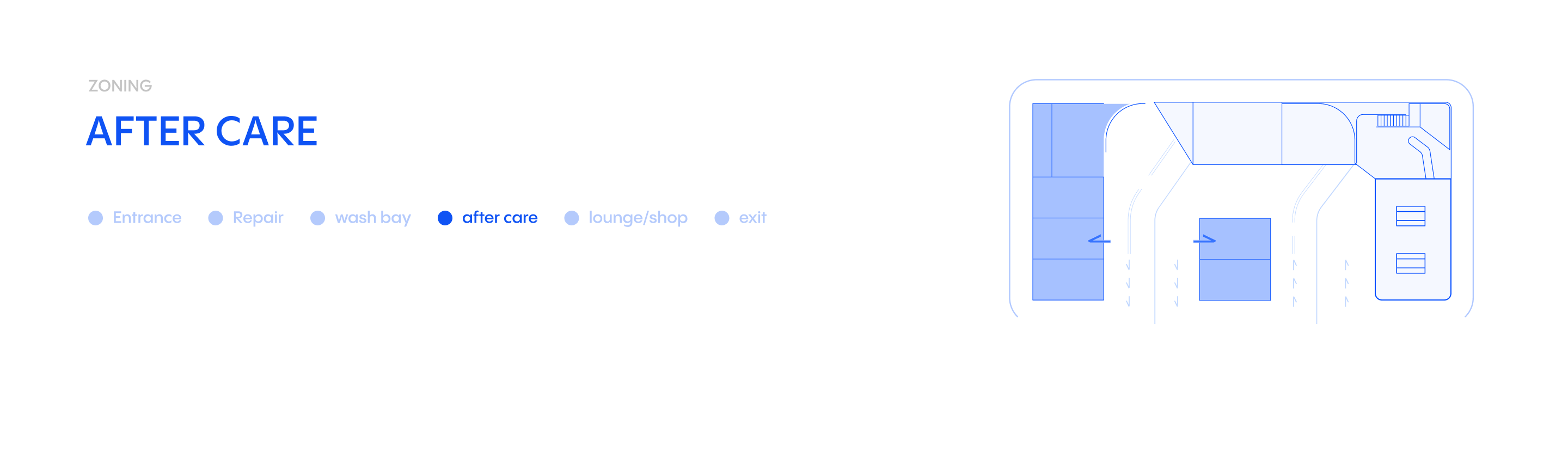 In the dense heart of the city, office workers are often exhausted by heavy traffic and endless waiting. addresses this urban fatigue by offering an affordable yet premium car wash experience, even within limited city spaces. Inspired by airport logistics, provides a fast and refreshing "car wash journey." By adapting airport systems to maximize space efficiency and turnover rate, we deliver an integrated brand experience that leaves customers feeling as if they have just returned from a revitalizing trip.