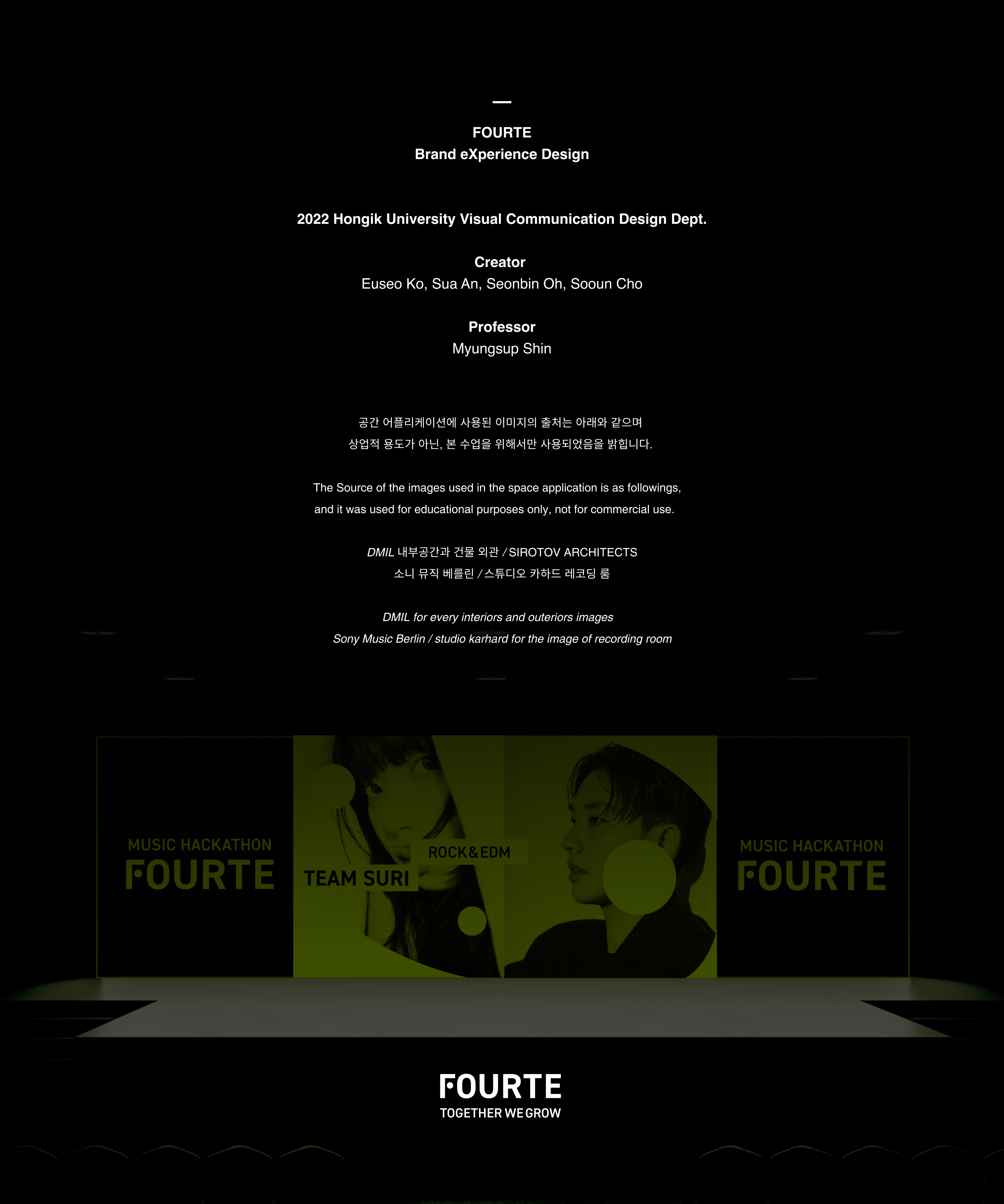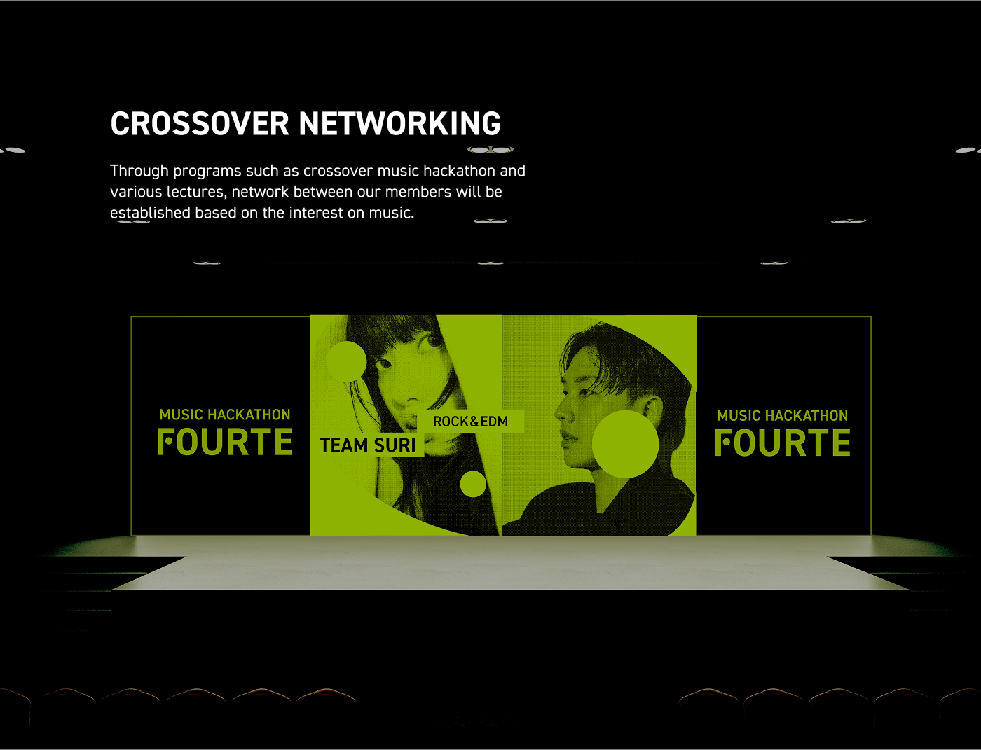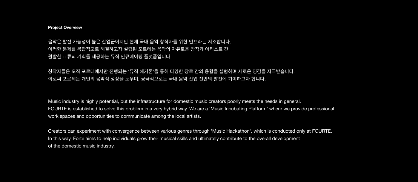 FOURTE is a music incubating platform that empowers creator growth through boundary-breaking crossover experimentation. By providing a flexible networking environment, the platform fosters a community where creators collaborate on in-depth projects. Inspired by the musical term 'Forte'—representing increasing intensity—the brand identity utilizes the structural logic of musical notation to visualize the powerful synergy created when people, music, and space converge.