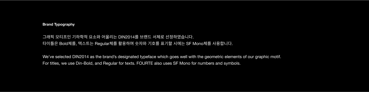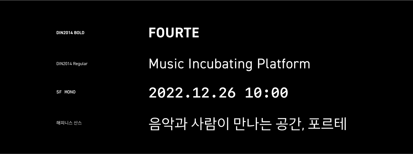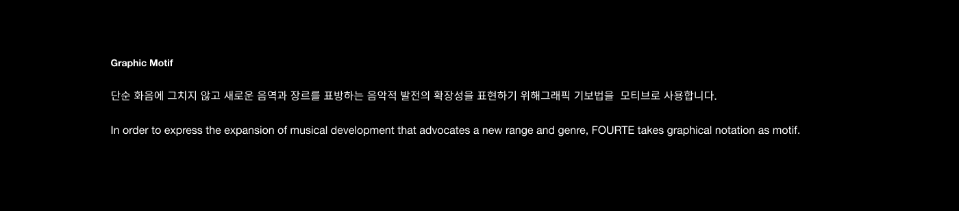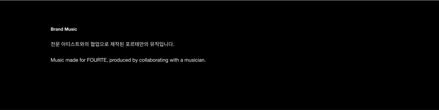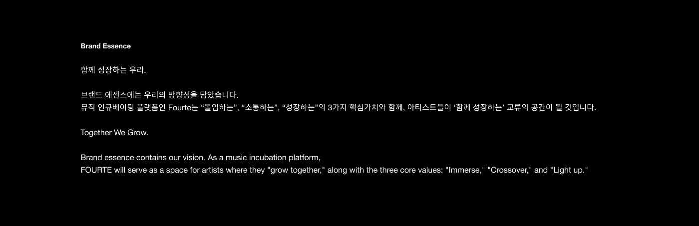 FOURTE는 음악 창작의 경계를 허무는 크로스오버를 시도하며, 창작자의 지속적인 성장을 지원하는 뮤직 인큐베이팅 플랫폼입니다. 유연한 네트워크 프로그램을 통해 창작자들이 교류하고 협업하며, 심도 있는 프로젝트를 완성해 나가는 상생의 커뮤니티를 지향합니다. '점점 세게'를 의미하는 음악 기호 포르테와 음악 기보법의 조형 원리를 차용하여, 사람과 음악, 그리고 공간이 만나 일으키는 강력한 시너지를 브랜드 아이덴티티에 담아냈습니다.