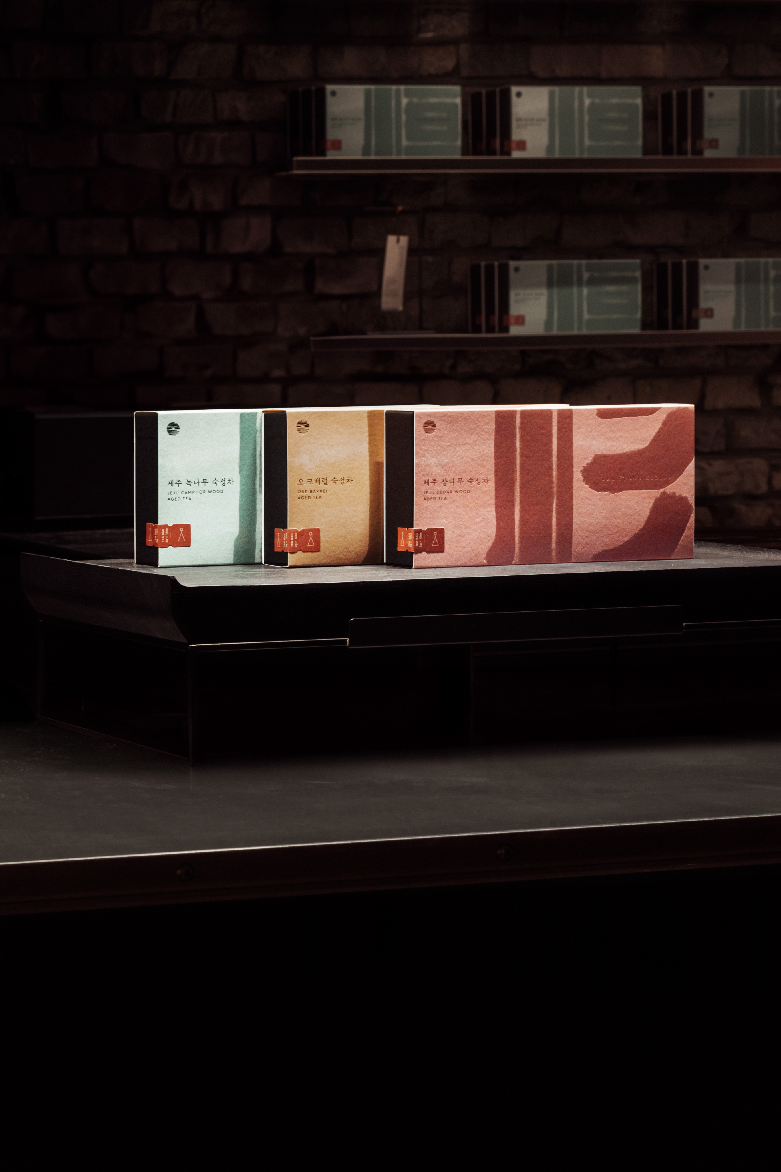 The Osulloc Tea Stone Cellar is a dedicated tea-aging space that captures the essence of Jeju’s nature and the profound depth of time. Located in the lower level of the 'Tea Stone'—a structure inspired by the narrative of a traditional inkstone—this space creates a mystical atmosphere where tea matures in silence and warmth.