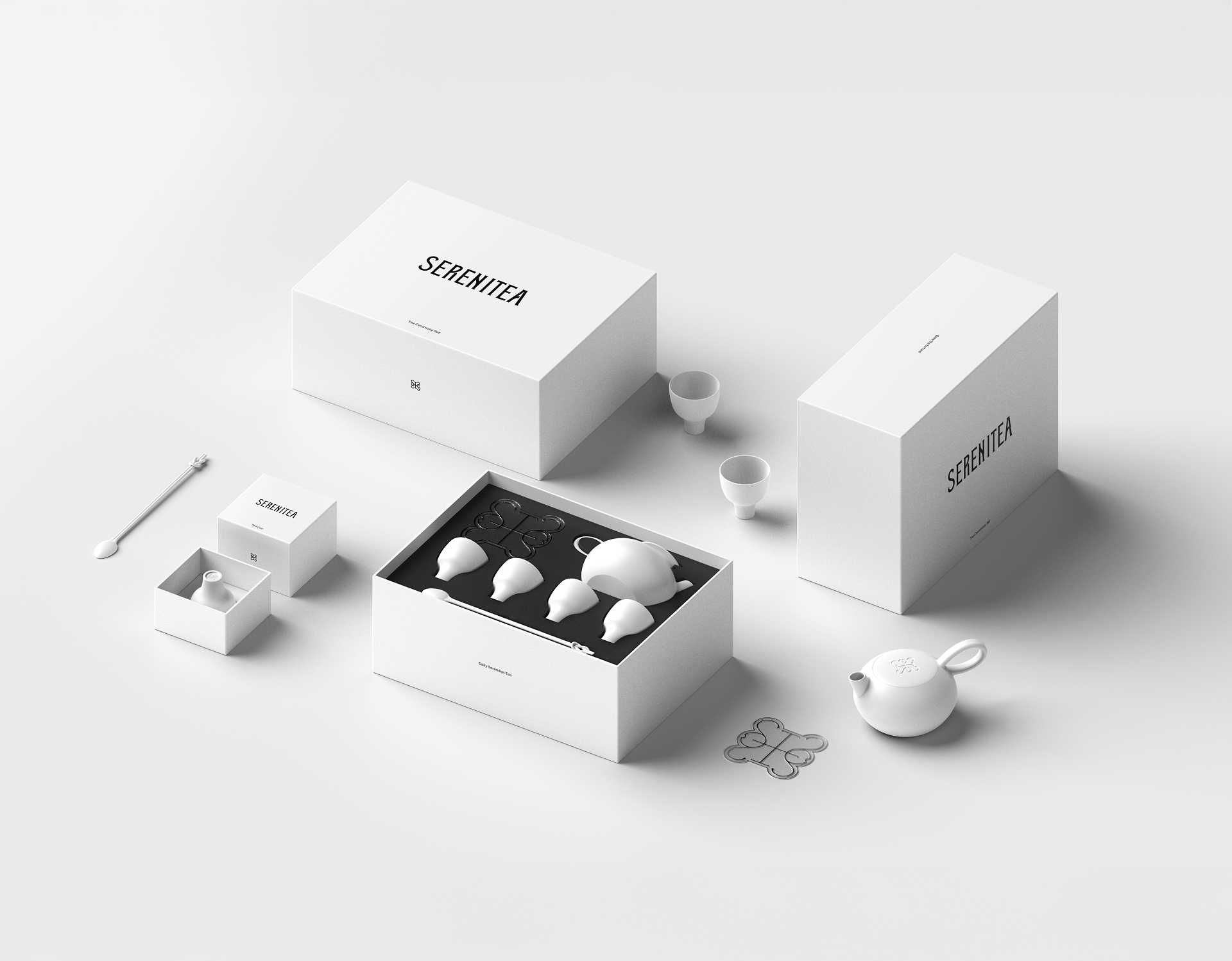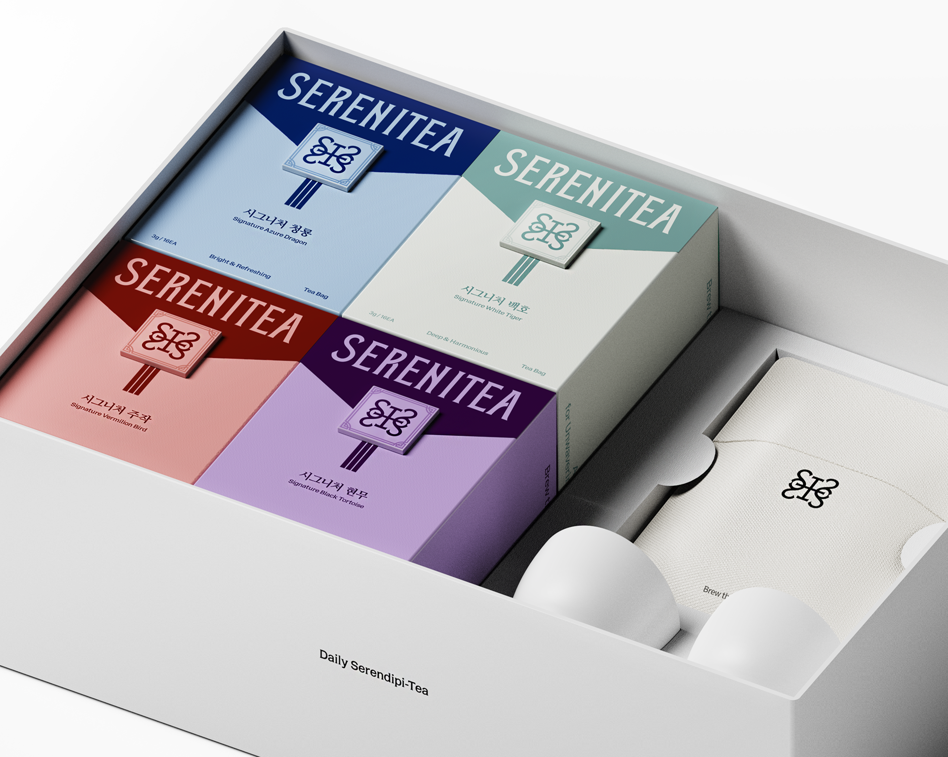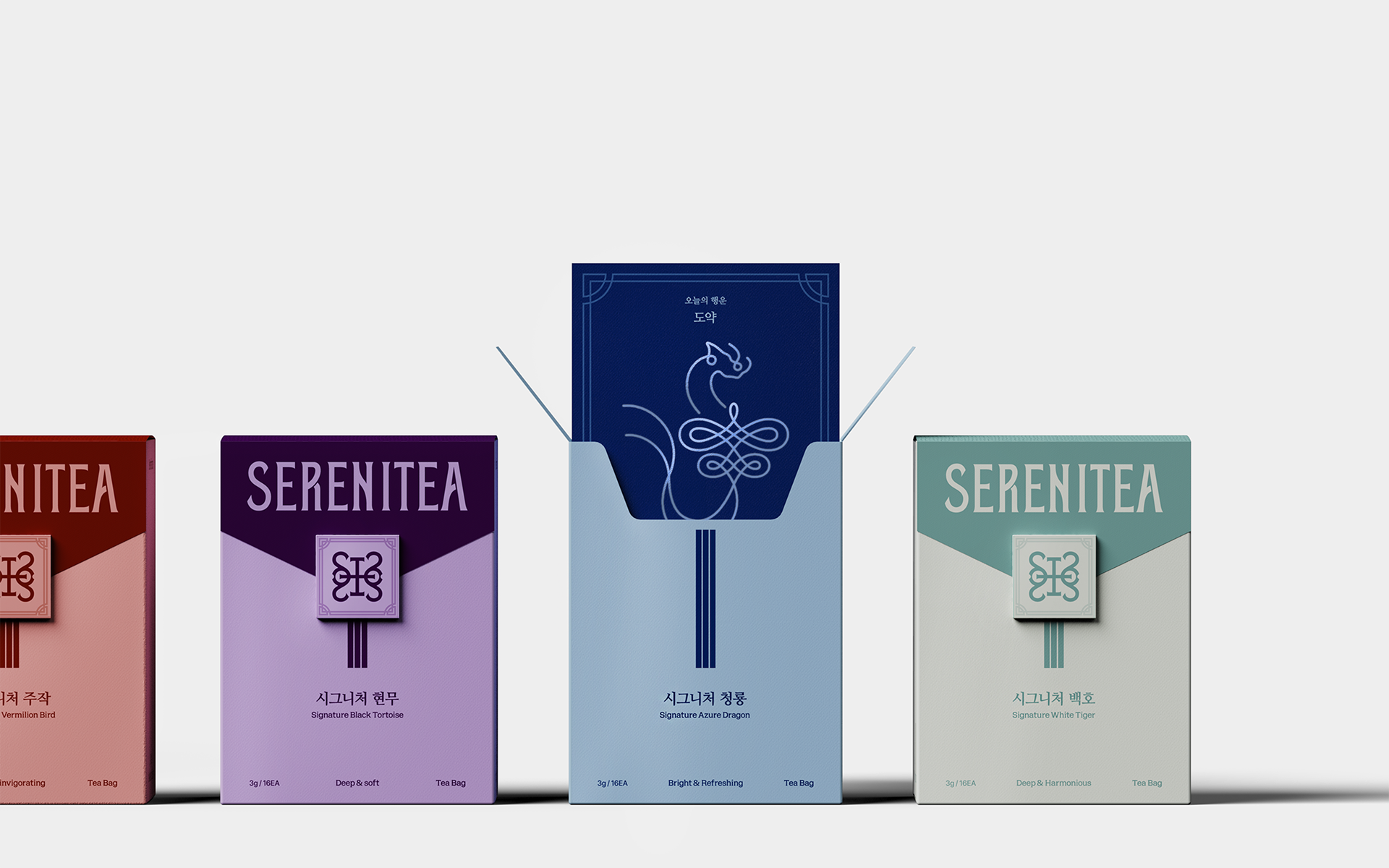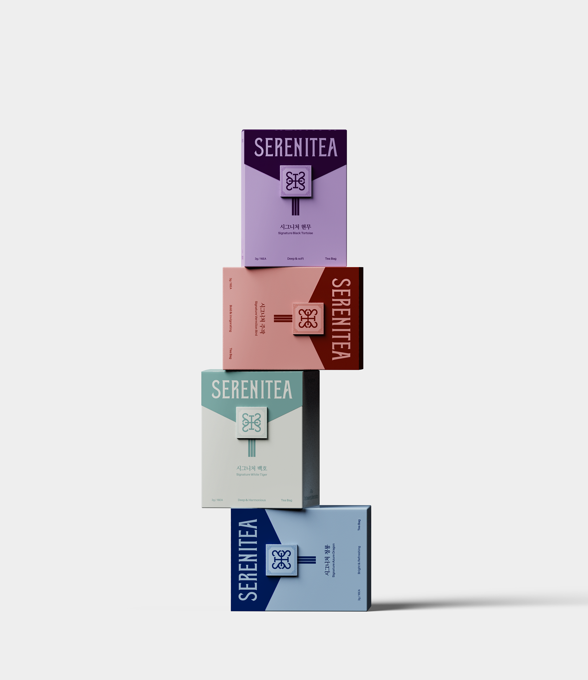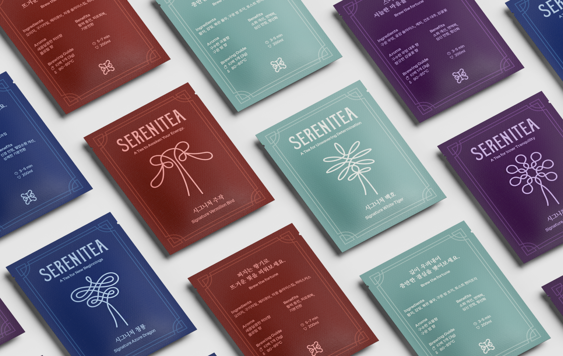 The design of SERENITEA began with the intention of reinterpreting the calm and symbolic nature of traditional Korean tea culture through a contemporary lens. Inspired by the mythology of the Four Guardian Spirits, the visual system expresses the unique energy and symbolism of each tea while framing tea drinking as a quiet everyday ritual. Traditional patterns and symbolic colors were translated into a modern graphic language to shape the brand identity, creating a visual experience that conveys moments of balance and tranquility through a cup of tea.
