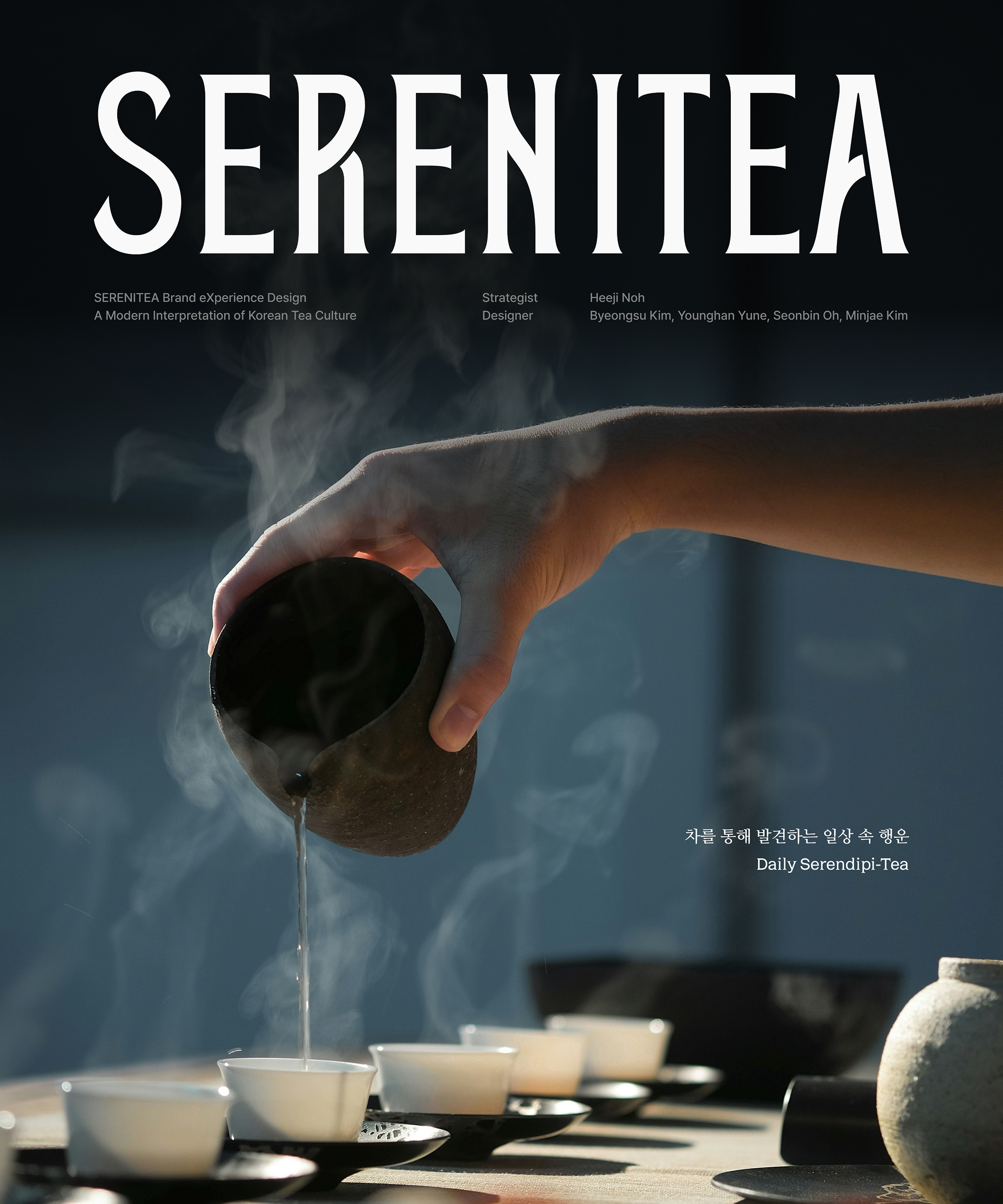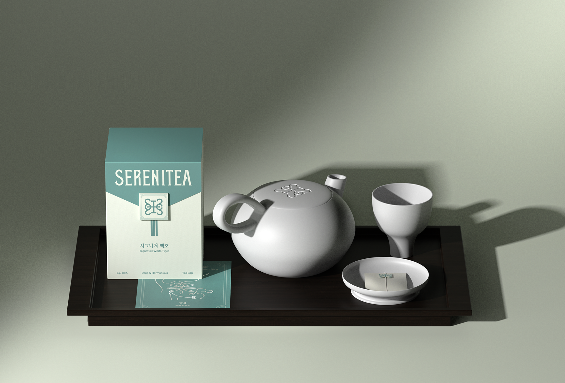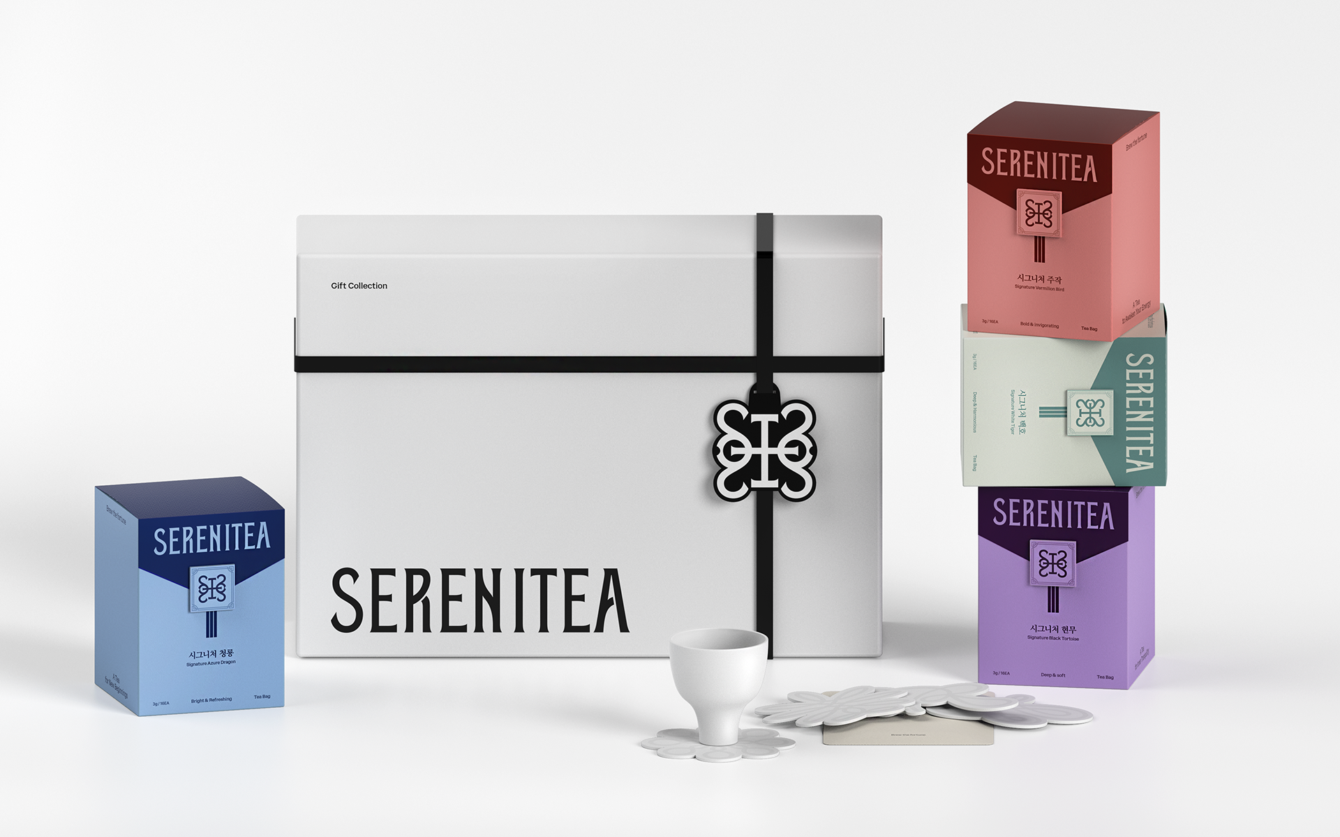 SERENITEA의 디자인은 한국 전통 차 문화가 지닌 고요한 분위기와 상징적 의미를 현대적인 감각으로 재해석하는 데서 출발했습니다. 사방신의 세계관을 모티프로 삼아 각 차가 지닌 기운과 상징성을 시각적으로 표현하고, 차를 마시는 시간을 일상의 작은 의식처럼 느낄 수 있도록 브랜드 경험을 설계했습니다. 전통 문양과 색의 상징성을 현대적인 그래픽 언어로 정리해 브랜드 아이덴티티에 담아냈으며, 차 한 잔을 통해 평온과 균형을 경험하는 순간을 시각적으로 전달하고자 했습니다.