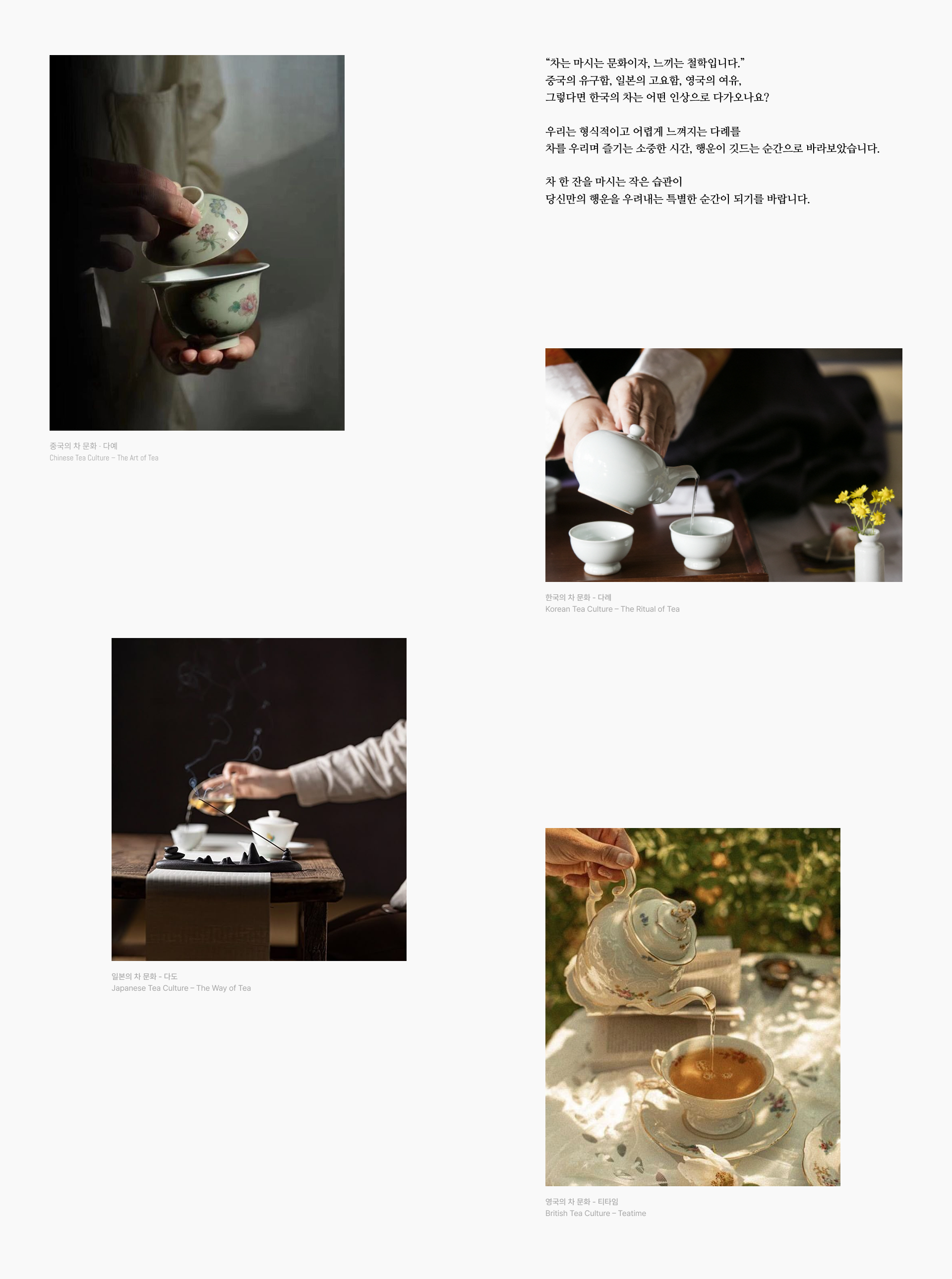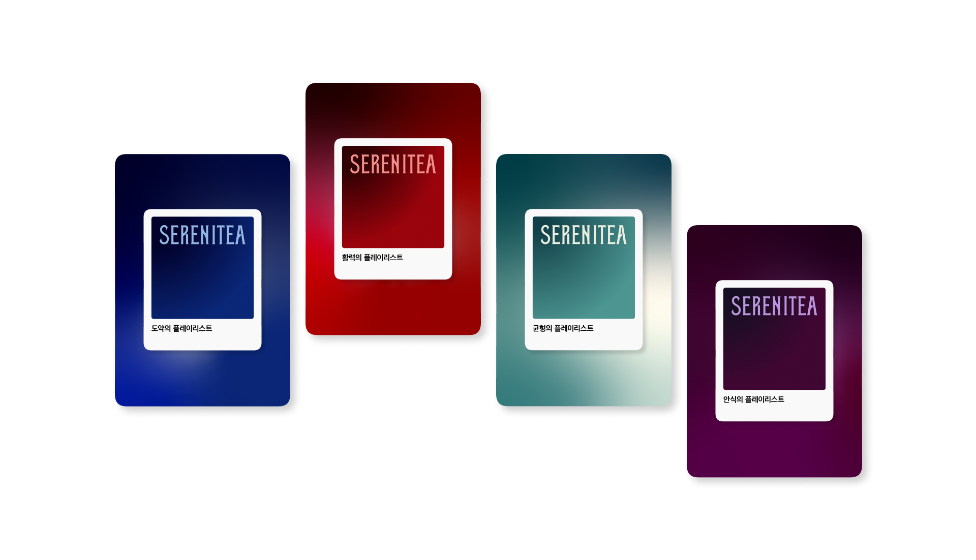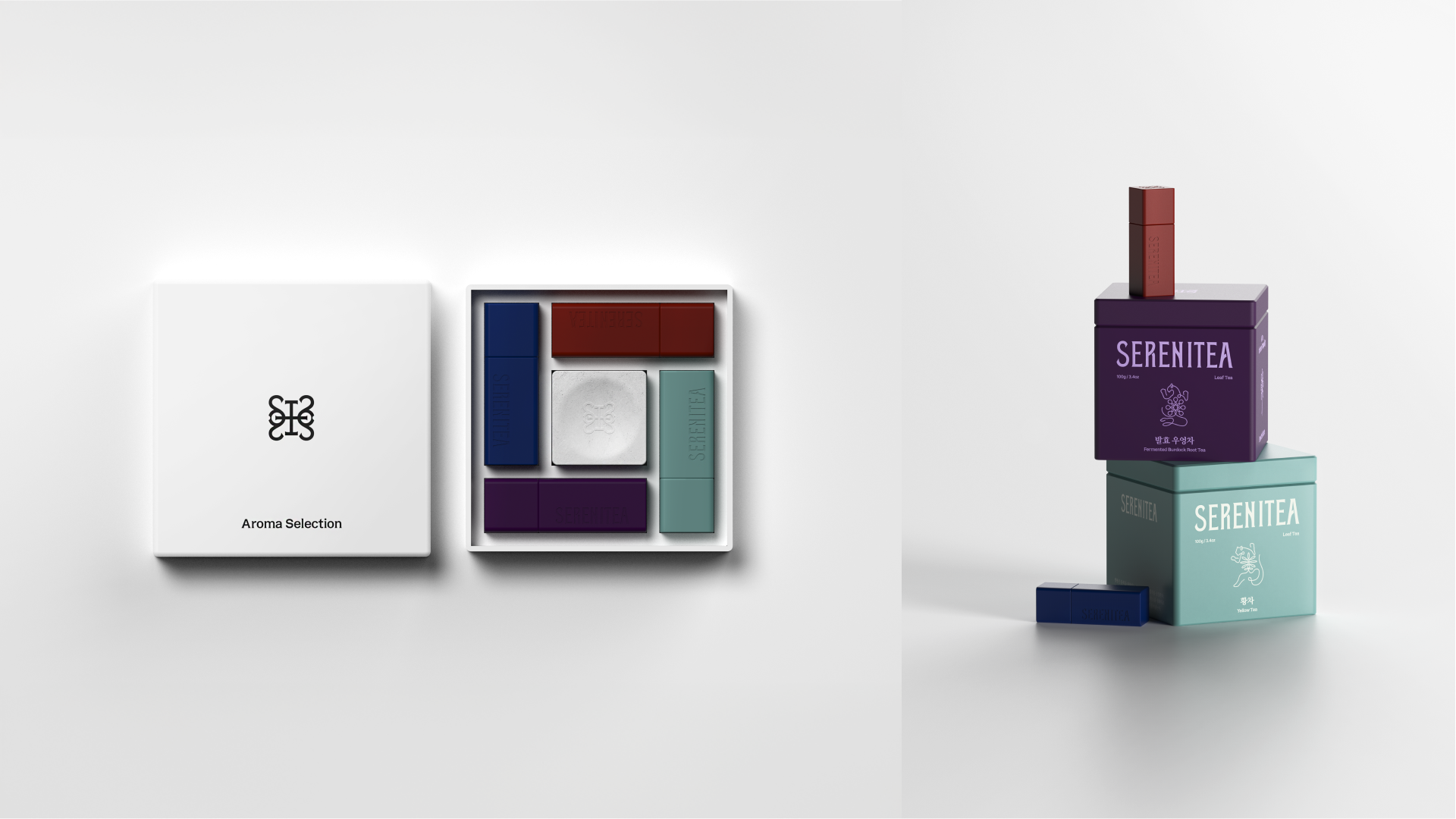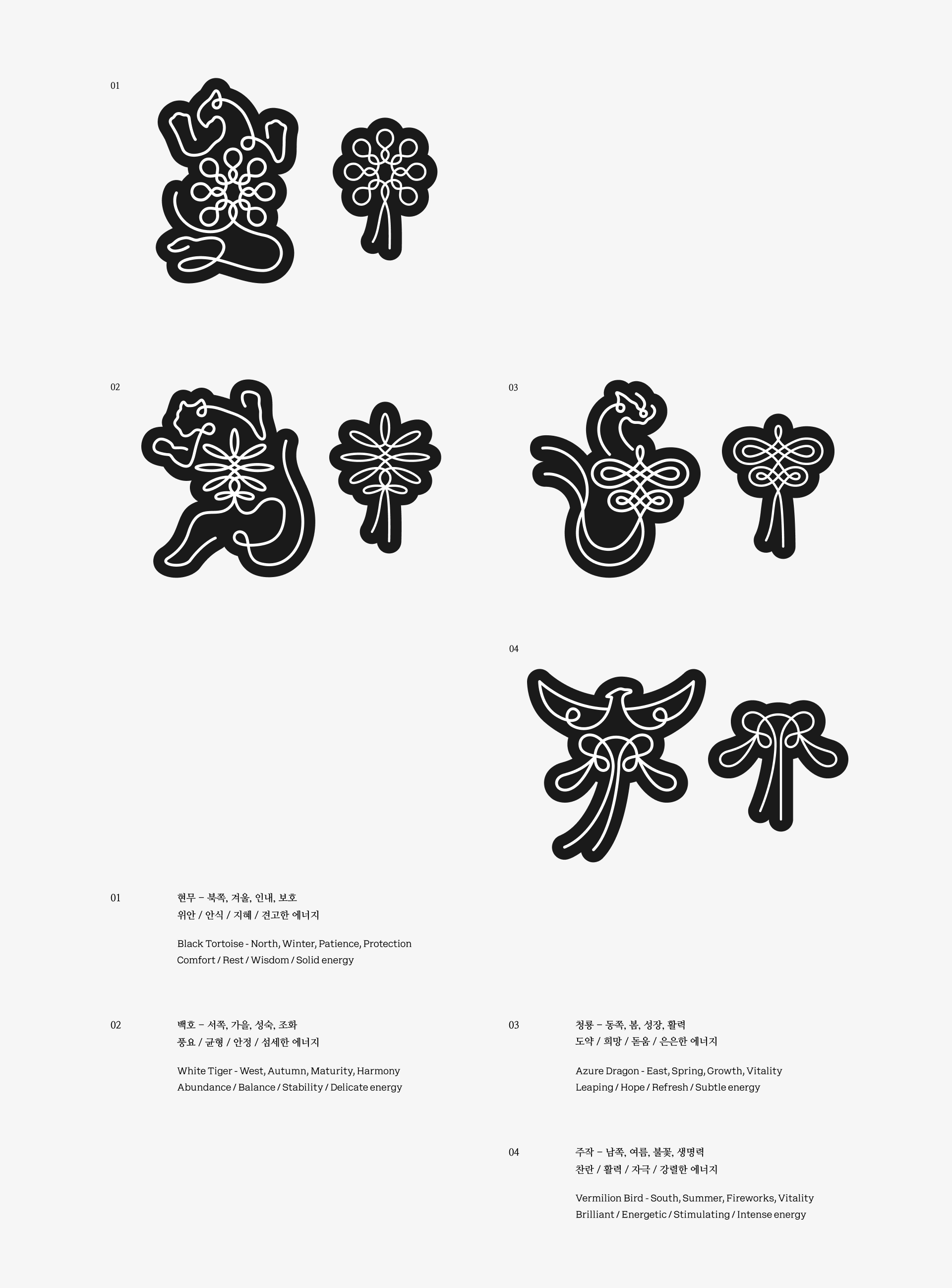 SERENITEA의 디자인은 한국 전통 차 문화가 지닌 고요한 분위기와 상징적 의미를 현대적인 감각으로 재해석하는 데서 출발했습니다. 사방신의 세계관을 모티프로 삼아 각 차가 지닌 기운과 상징성을 시각적으로 표현하고, 차를 마시는 시간을 일상의 작은 의식처럼 느낄 수 있도록 브랜드 경험을 설계했습니다. 전통 문양과 색의 상징성을 현대적인 그래픽 언어로 정리해 브랜드 아이덴티티에 담아냈으며, 차 한 잔을 통해 평온과 균형을 경험하는 순간을 시각적으로 전달하고자 했습니다.