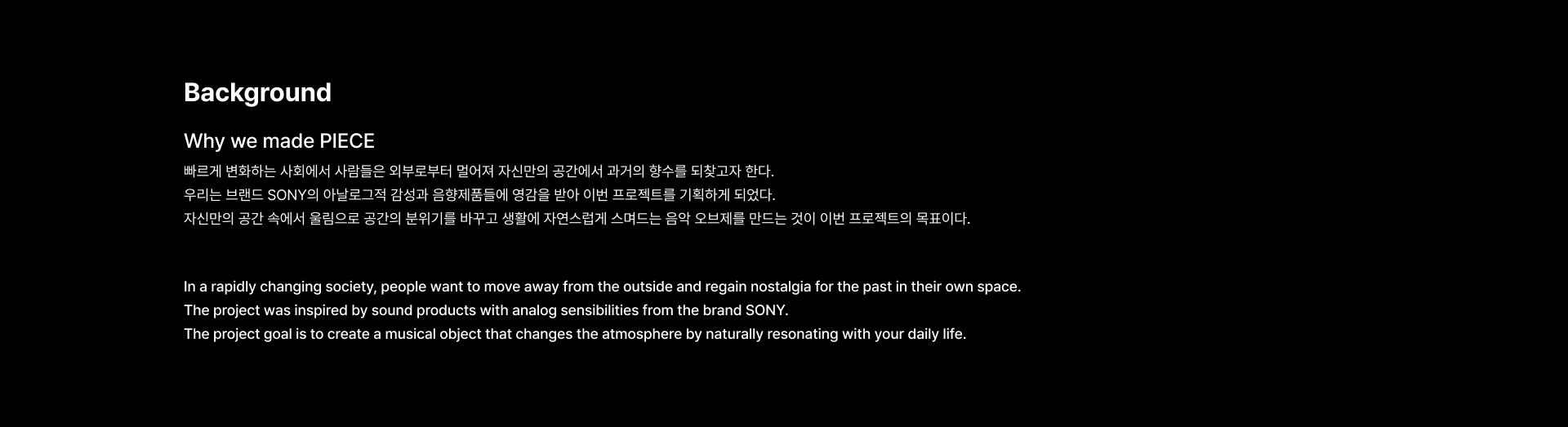 PIECE는 일상의 빈틈을 채우고, 생활 속에 조화롭게 녹아든 뮤직 오브제를 통해 다채로운 시간을 선사합니다. 그 첫 번째 시작인 OP.1은 가정용 LP 턴테이블로, 일상적인 공간에서 시대의 정취를 담은 생생한 사운드 경험을 즐길 수 있게 합니다.